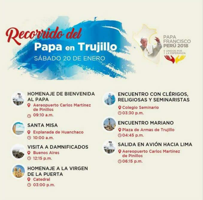 Comisiones enviadas por el Vaticano, del Arzobispado Metropolitano de Trujillo, del Gobierno Nacional, regional y local, definieron los lugares, las horas (aproximadas) y vías por donde transitará e impartirá su bendición apostólica el santo Papa. Esto, luego de una serie de inspecciones, reuniones y consultas, realizadas con anticipación.