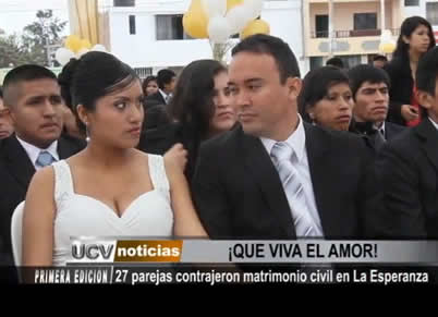 27 parejas se casaron en el distrito de La Esperanza. El acto fue presidido por el alcalde Daniel Marcelo quien destacó la importancia de esta unión civil en la sociedad. La ceremonia se realizó como parte de las actividades por Fiestas Patrias.