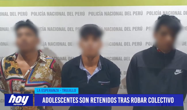 Tres adolescentes fueron retenidos por la policía nacional tras participar en u asalto a mano armada. Un colectivero llegó hasta la comisaría de Alto Trujillo y denunció que cuatro sujetos le habían robado su unidad de placa de rodaje T5Q-638 a la altura de la avenida Las Margaritas, en el distrito El Porvenir.