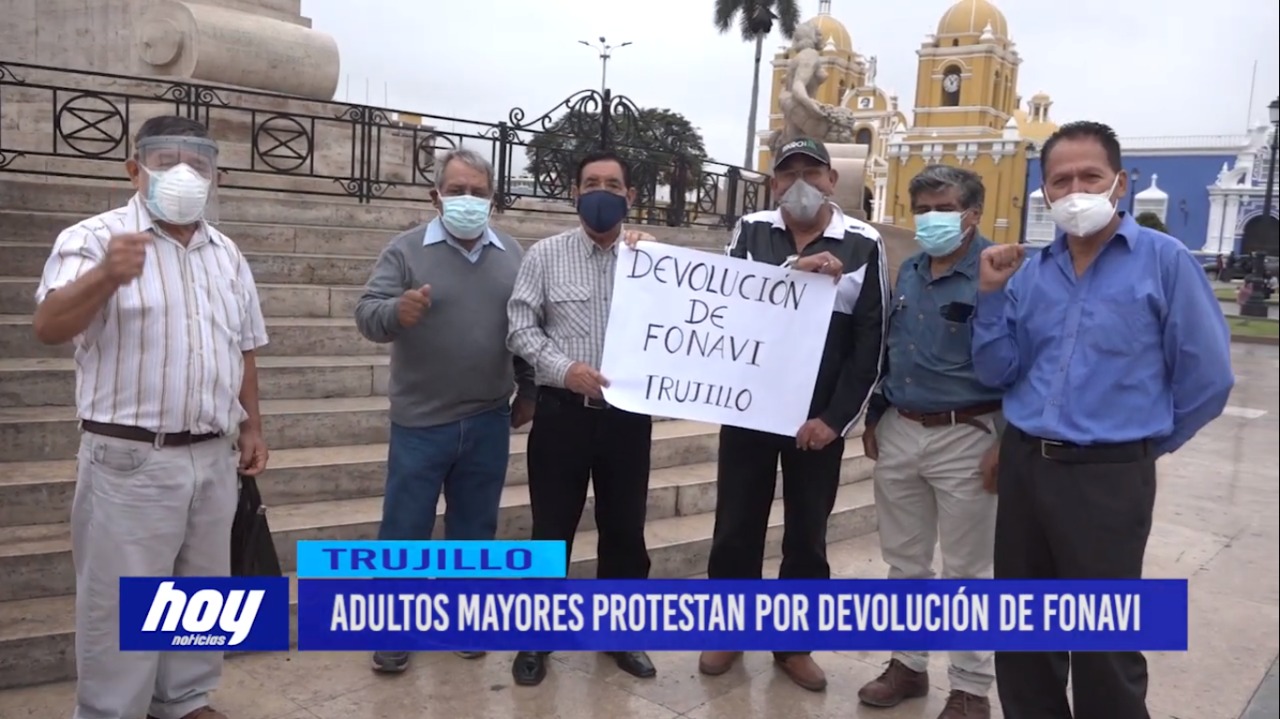 Integrantes de la coordinadora nacional de fonavistas reclamaron por la devolución de sus aportes al Fonavi. Un grupo de adultos mayores llegó a la plaza de armas de la ciudad de Trujillo, para mostrar su malestar pues señalan que existe mucha demora, es por ellos que se sumaron a esta protesta que se realiza a nivel nacional.