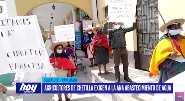 Con carteles en mano y arengas, agricultores del distrito de Chetilla, llegaron hasta la plaza de armas de la ciudad de Guadalupe en la provincia de Pacasmayo, región La Libertad. Esto para exigir a la Autoridad Nacional del Agua (ANA) el abastecimiento del recurso hídrico.