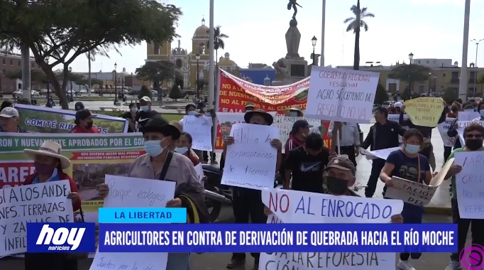 Los agricultores de los distritos de Laredo y Moche llegaron a los exteriores del Gobierno Regional La Libertad para mostrar su rechazo respecto a la construcción de diques y a la derivación de la quebrada San Idelfonso hacia el río Moche. Según indicaron la empresa encargada del proyecto ya está interviniendo y los especialistas habrían ingresado a los terrenos amenazando a los agricultores para que puedan sacar el metraje de estos lugares.