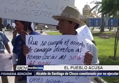 El Comité de Gestión del Agua Potable de Santiago de Chuco, solicitó al Ministerio Público, iniciar una acción penal contra el alcalde de dicha provincia y el titular del fondo social, por no iniciar la construcción de redes de agua para seis caseríos, pese a que cuentan con presupuesto desde el año pasado.