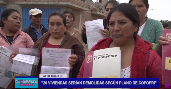 Un grupo de moradores del distrito de Alto Trujillo denunciaron que COFOPRI está intentando desalojarlos de sus viviendas sin previo aviso. Aseguran que fueron sorprendidos hace unos días con la presentación de un nuevo plano que indica la demolición de 20 casas. Estas viviendas están ubicadas en una zona que se convertirá en una vía doble.