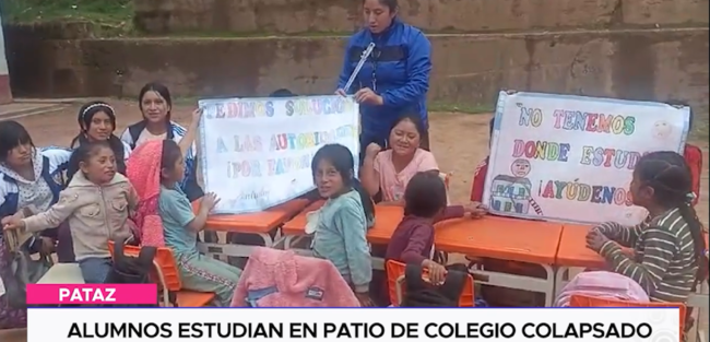 ¡Piden estudiar dignamente! Un grupo de alumnos de nivel primara del colegio Ricardo Palma del distrito de Tayabamba, en Pataz, vienen estudiando en el patio de la institución ya que parte de la infraestructura ha colapsado por las lluvias.