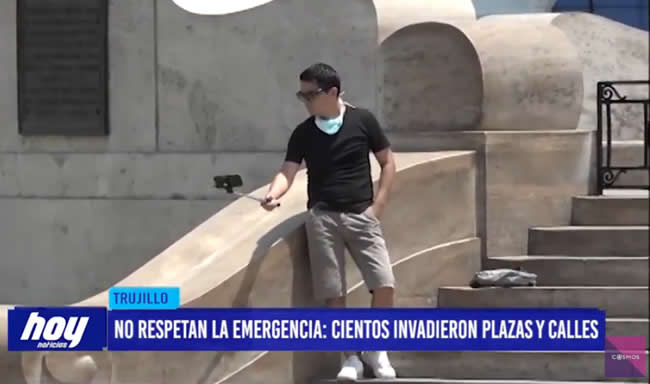 En la Plaza de Armas de Trujillo largas colas en entidad bancaria, asimismo algunos ambulantes hacen negocio con mascarillas y otras aprovechan para sacarse fotos en estado de emergencia.