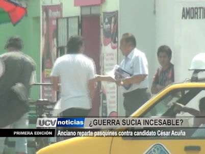 Nuestras cámaras sorprendieron a un anciano en los precisos momentos en que repartía pasquines contra el candidato a la presidencia del Gobierno Regional, César Acuña Peralta.