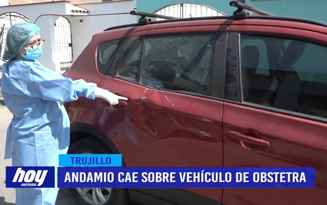 Indignada, así se mostró la obstetra Andrea Robles, quien labora en el centro de Atención Primaria III Metropolitano Trujillo, por lo que formuló su denuncia correspondiente luego que un andamio cayera sobre su vehículo estacionado fuera de su centro laboral, la profesional de la Salud, indicó que la obra en una clínica particular Virgen de Alta Gracia generó este incidente que pudo dejar un saldo lamentable, si hubiera caído encima de un paciente o personal de este centro.