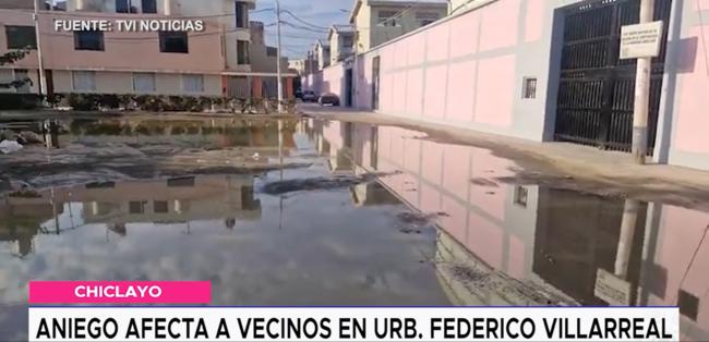 Un aniego causado por el colapso de una tubería de agua ha generado preocupación entre los vecinos de la urbanización Federico Villarreal, en la ciudad de Chiclayo. El incidente ocurrió en las inmediaciones del colegio Rosario, donde grandes cantidades de agua han inundado la vía, afectando el tránsito peatonal y vehicular.