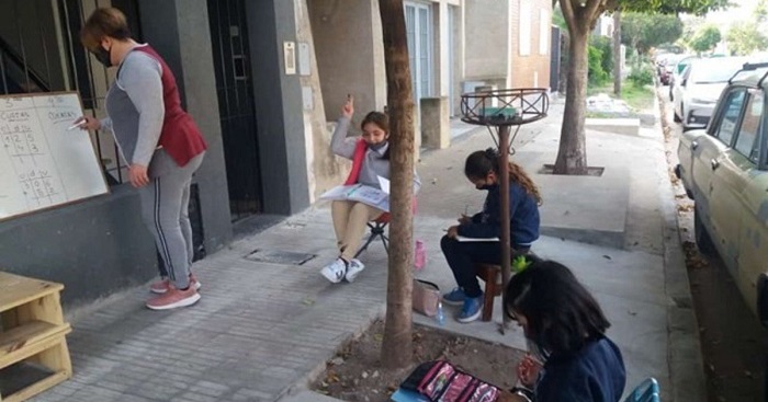 La docente argentina María del Luján decidió dar clases en la vereda de su vivienda para los niños respetando los protocolos sanitarios de COVID-19.