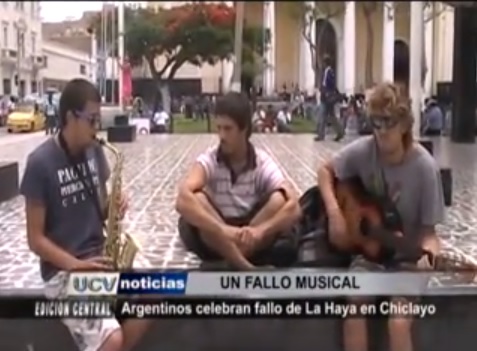 Un grupo de músicos argentinos se mostraron a favor con el fallo emitido por la corte de la Haya en la cual Perú recupero muy buena cantidad de terreno marítimo. Con guitarra y saxo en mano realizaron una pequeña exhibición en la pérgola del parque principal de Chiclayo donde incluso hicieron varias canciones a favor de nuestra nación.