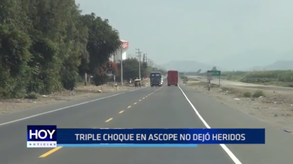 Un triple choque se registró en inmediaciones del puente Careaga, en Ascope. Un camión cargado con agua mineral impactó contra una minivan y ésta, a su vez, contra un ómnibus de Emtrafesa.