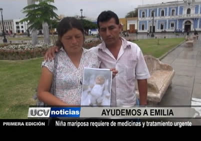 Los padres de familia de una menor que nació con la enfermedad «piel de mariposa» solicitan ayuda de la población para el tratamiento médico de su hija. Ellos necesitan 200 soles diarios para adquirir los medicamentos.