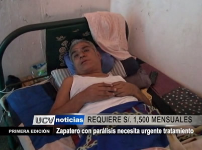 Un zapatero, quien sufrió hace tres meses un derrame cerebral y ahora se encuentra con parálisis en una mitad de su cuerpo, pide ayuda a la colectividad para costearse el tratamiento de rehabilitación cuyo costo supera los mil quinientos soles por mes.