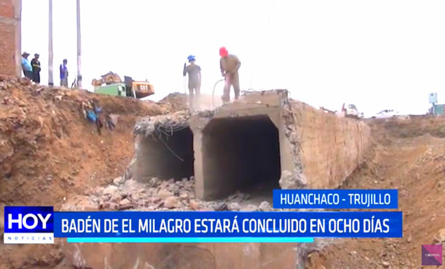 El badén de la carretera Panamericana Norte a la altura del centro poblado El Milagro estará concluido en 8 días, así lo informó el alcalde de Trujillo, Daniel Marcelo, quien inspeccionó la obra.