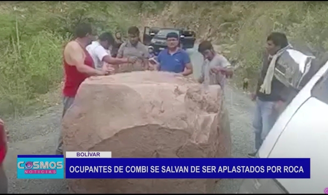 Los ocupantes de una combi se salvaron de sufrir un trágico accidente en la provincia de Bolívar, luego de que una gigantesca roca cayera en medio de una carretera, tras un deslizamiento, producto de las intensas lluvias.