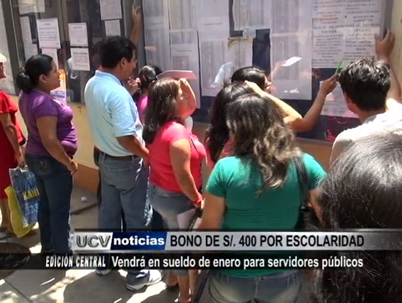 La asignación del bono de escolaridad a los trabajadores del sector público en el país será hasta de 400 soles, monto adicional que será entregado junto al sueldo del mes de enero. Jubilados y miembros de las Fuerzas Armadas también son los beneficiados.
