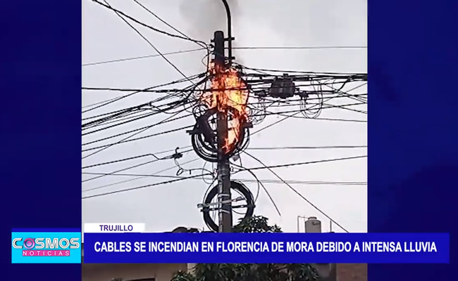 En el distrito trujillano de Florencia de Mora la fuerte lluvia que se registró en la ciudad de Trujillo generó que marañas de cables se incendien, por ejemplo, en la calle Alfonso Ugarte, esto fue lo que ocurrió con dos postes.