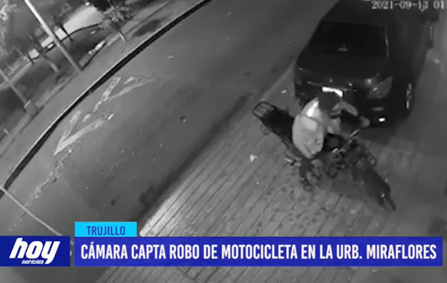 Cámara se seguridad de un inmueble registró el robo de una motocicleta estacionada en la calle Manuel Encinas de la urbanización Miraflores.