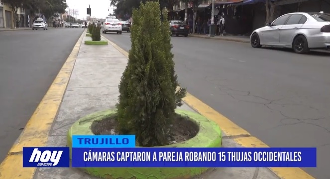 Malos ciudadanos volvieron a hacer de las suyas llevándose 15 thujas occidentales del perímetro de la avenida España, esta vez cámaras de seguridad de un centro comercial de la zona captaron el hecho, como podemos observar en las imágenes un varón y una fémina actúan en complicidad llevando las plantas en un vehículo, el gerente de gestión ambiental no descarta que estas mismas personas hayan hurtado anteriormente cerca de Hidrandina.