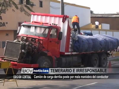 Una mala maniobra de su conductor provocó que un camión de carga derribara una cabina telefónica y un poste de telefonía, en la intersección de las avenidas Vallejo y Villarreal.