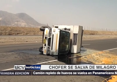 Inicio Actualidad Camión repleto de huevos se volcó en Panamericana Norte ActualidadNoticiasTrujillo Camión repleto de huevos se volcó en Panamericana Norte Por Tv Cosmos - 04/05/2015 553 0 FacebookTwitterPinterestWhatsApp Un camión repleto de huevos se volcó en plena Panamericana Norte. Increíblemente el chofer y su acompañante salieron ilesos. TE PUEDE INTERESAR Si te interesa nuestras noticias, puedes seguir nuestras últimas publicaciones por Facebook, Twitter, y puedes suscribirte aquí a nuestro canal de TUITEA, COMENTA Y COMPARTE Tweets by CosmosNoticiasPe Artículos relacionadosMás del autor NUEVO CONSEJO DIRECTIVO ASUME LA ASOCIACIÓN NUMISMÁTICA Y FILATÉLICA DE TRUJILLO Congreso premiará este martes a ganadores del Concurso Nacional de Fotografía “Mujeres que Inspiran” Alejandro Sanz presenta el video de ‘Rimowa’ en colaboración con Elena Rose POPULAR CATEGORIESNoticias66232Actualidad51007Trujillo42650Nacionales9348Deportes7303Espectáculos4545 NUEVO CONSEJO DIRECTIVO ASUME LA ASOCIACIÓN NUMISMÁTICA Y FILATÉLICA DE TRUJILLO TV COSMOS - 05/03/2026 0 Congreso premiará este martes a ganadores del Concurso Nacional de Fotografía “Mujeres que Inspiran” TV COSMOS - 03/03/2026 0 Alejandro Sanz presenta el video de ‘Rimowa’ en colaboración con Elena Rose TV COSMOS - 23/02/2026 0 Jaze logra su primer sold out en México y consolida su gira internacional TV COSMOS - 23/02/2026 0 Han pasado más de 20 años y la anemia sigue afectando a más del... TV COSMOS - 19/02/2026 0 - Advertisement -