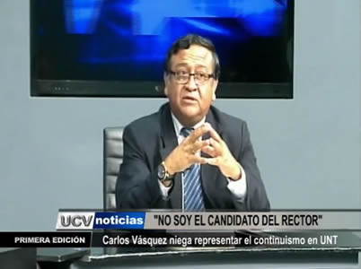 El candidato al rectorado de la Universidad Nacional de Trujillo, Carlos Vásquez Boyer, se presentó en la última edición del programa Contacto, en el que negó ser el candidato del actual rector y de representar el continuismo en esta casa superior de estudios. Cuando se le consultó acerca de si solicitará una auditoria a la gestión saliente, respondió que esto tendría que analizarse.