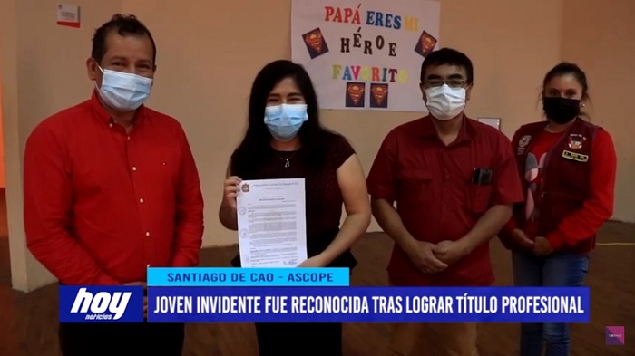Tras este gran paso, la Municipalidad de Santiago de Cao, en una ceremonia realizada en la casa de la cultura de Cartavio, reconoció a esta joven invidente quien a los 10 años de edad perdió la vista, dejó de estudiar, pero lo culminó mediante un colegio no escolarizado, para después de una dura preparación ingresar al conservatorio Carlos Valderrama y hoy convertirse en esta destacada profesional en la música.