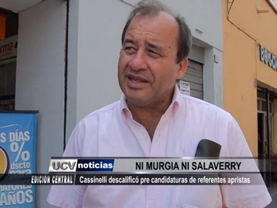 El ex aprista Eduardo Cassinelli descalificó las pre candidaturas de José Murgia y Daniel Salaverry aduciendo que no significarán un avance para la región La Libertad ni para la provincia de Trujillo. En el caso de Salaverry Villa, le aconsejó que si quiere ser alcalde primero debe dejar de beneficiarse de los programas de vivienda del estado.