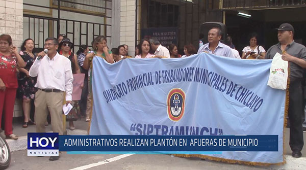 Un grupo de trabajadores administrativos de la municipalidad de Chiclayo hicieron un plantón en los exteriores de la comuna ante la falta de diálogo, el pago de sus haberes del mes de diciembre, incumplimiento de pago colectivos y, según ellos, la falta de experiencia del alcalde para solucionar los problemas de Chiclayo.