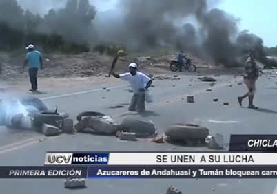 En Chiclayo, azucareros de Andhuasi llegan desde Lima para sumarse a manifestaciones de trabajadores de Tumán en Chiclayo. Nuevamente bloquean la carretera.