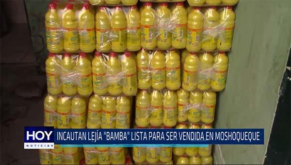 Efectivos de la comisaria de José Leonardo Ortiz decomisaron lejía presuntamente adulterada que iba a ser vendida en en el mercado de Moshoqueque. Este producto estaría valorizado en cinco mil soles.