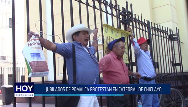 Jubilados de la agroindustrial Pomalca se amarraron en rejas de la Catedral de Chiclayo exigiendo al Grupo Oviedo les cancele todo lo adeudado. Son más de 2 mil ex trabajadores que reclaman sus pagos.