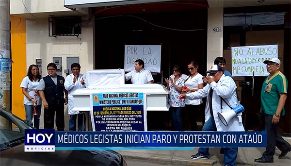 Médicos legistas de Lambayeque protestaron con un ataúd en el marco del paro de 48 horas que iniciaron, exigiendo el aumento de sus remuneraciones