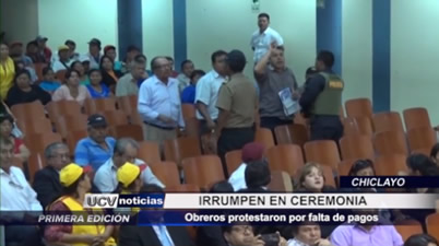 En Chiclayo, obreros irrumpieron en la sesión de aniversario del distrito de Leonardo Ortiz para protestar por estar impagos desde hace meses.