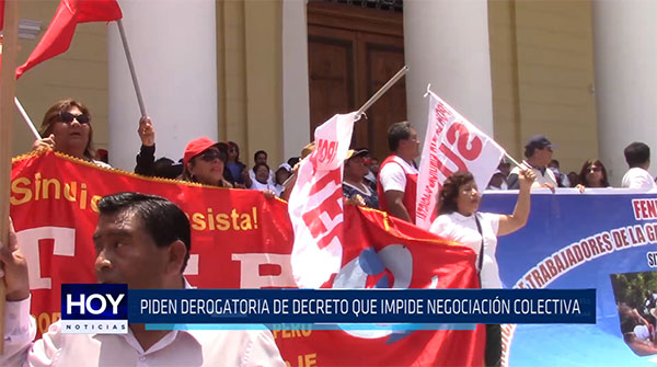 Sindicatos afiliados a la CGTP realizaron un plantón en la catedral de Chiclayo exigiendo se derogue los decretos legislativos que van en contra de la negociación colectiva. Le piden al gobierno de Vizcarra que no actué de forma anticonstitucional.