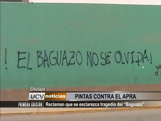 En la víspera de conmemoración de los cuatro años del «Baguazo» aparecieron pintas tildando al partido aprista de asesino. «El Baguazo no se olvida» dice la pinta que fue hecha a una cuadra del partido de la estrella. Como se recuerda, el 5 de junio del 2009 estalló un conflicto en Bagua, Utcubamba e Imacita en el que fallecieron 23 policías, 10 civiles y un oficial policial quedó desaparecido.