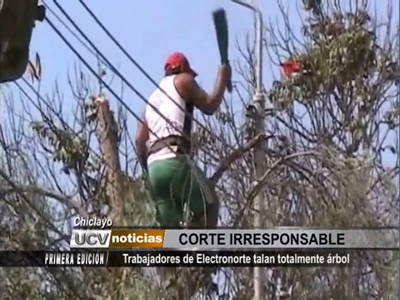 Un árbol que embellecía el paisaje de la ciudad fue totalmente talado por personal de Ornato Público de la Municipalidad Provincial de Chiclayo porque los propietarios de un centro comercial próximo se quejaron de que las ramas del árbol ya alcanzaban la altura de los cables de electricidad. Lo que llamó la atención de vecinos y transeúntes fue el exceso del corte del árbol.