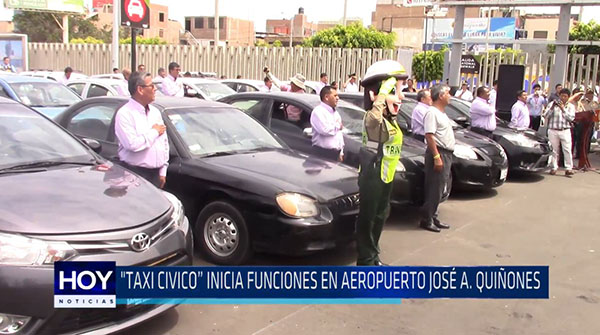 Se instaló programa «Taxi Cívico» en aeropuerto José A. Quiñones Gonzáles con la finalidad de evitar que los turistas tanto nacionales como extranjeros sean víctimas de la delincuencia. Son 26 unidades las que estarán en comunicación con la policía nacional.