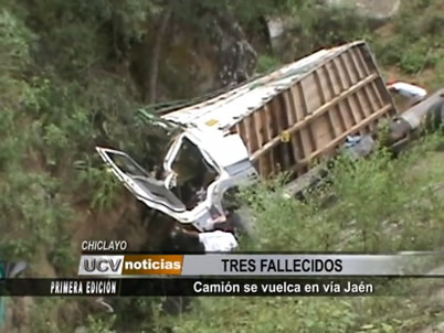 Inicio Noticias Chiclayo Chiclayo: Tres fallecidos tras volcadura de camión NoticiasChiclayoNacionales Chiclayo: Tres fallecidos tras volcadura de camión Por Tv Cosmos - 14/05/2014 604 0 FacebookTwitterPinterestWhatsApp Tres personas fallecieron y dos quedaron heridas luego del despiste y posterior vuelco de un camión en la carretera Jaén – Chiclayo. TE PUEDE INTERESAR Si te interesa nuestras noticias, puedes seguir nuestras últimas publicaciones por Facebook, Twitter, y puedes suscribirte aquí a nuestro canal de Cosmos Noticias TUITEA COMENTA Y COMPARTE Tweets by CosmosNoticiasPe Artículos relacionadosMás del autor Congreso premió a ganadores del concurso “Mujeres que Inspiran” PRIN oficializa candidatura presidencial y equipo piurano al Congreso Rospigliosi saluda a los peruanos por Navidad y ratifica compromiso con el país POPULAR CATEGORIESNoticias66232Actualidad51007Trujillo42650Nacionales9348Deportes7303Espectáculos4545 NUEVO CONSEJO DIRECTIVO ASUME LA ASOCIACIÓN NUMISMÁTICA Y FILATÉLICA DE TRUJILLO TV COSMOS - 05/03/2026 0 Congreso premiará este martes a ganadores del Concurso Nacional de Fotografía “Mujeres que Inspiran” TV COSMOS - 03/03/2026 0 Alejandro Sanz presenta el video de ‘Rimowa’ en colaboración con Elena Rose TV COSMOS - 23/02/2026 0 Jaze logra su primer sold out en México y consolida su gira internacional TV COSMOS - 23/02/2026 0 Han pasado más de 20 años y la anemia sigue afectando a más del... TV COSMOS - 19/02/2026 0 - Advertisement -