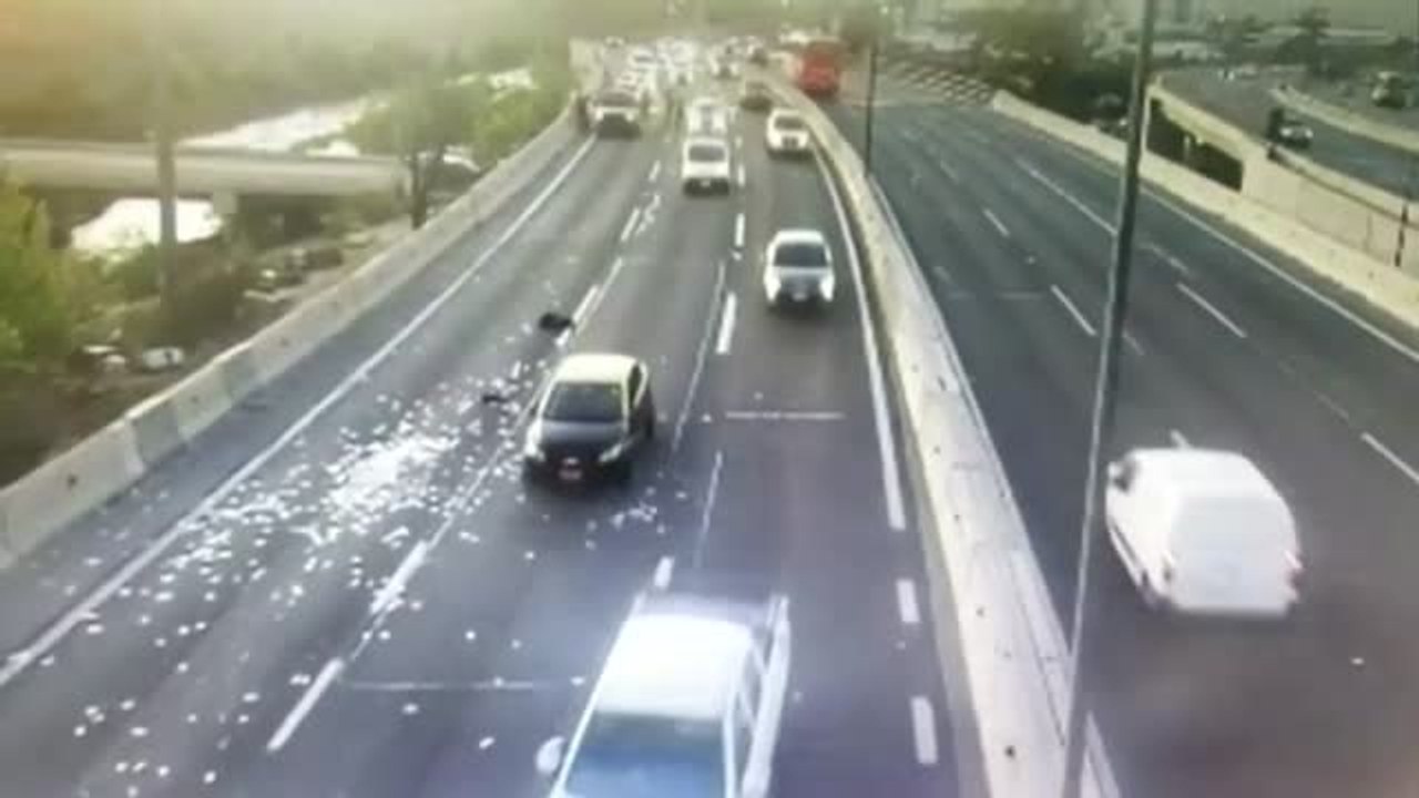 En plena persecución arrojan el bolso con el dinero que habían robado, se rompe y los billetes se esparcen por el pavimento, la particular escena tuvo lugar en una autopista de Santiago de Chile, tras el robo de un local de máquinas tragamonedas, a manos de un grupo de asaltantes, la mayoría de nacionalidad peruana.