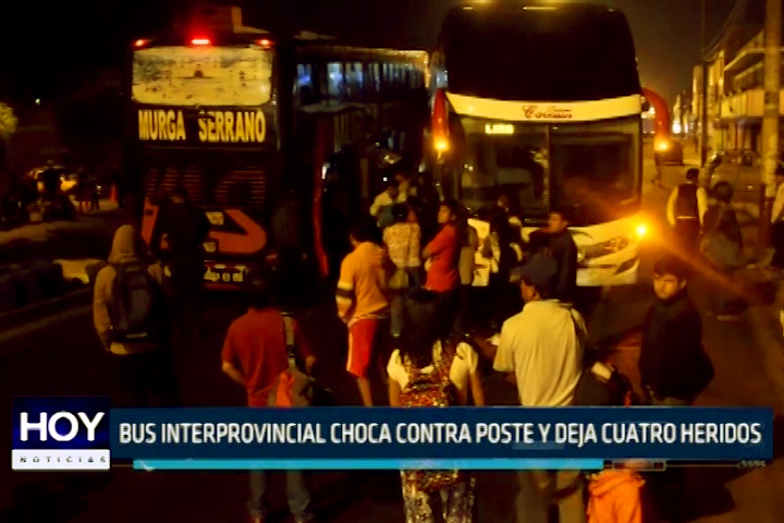 Cuatro personas heridas y decenas de pasajeros varados dejó la colisión entre un bus interprovincial de la empresa de transportes Murga Serrano y un poste de alumbrado público en la avenida Enrique Meiggs. El accidente se produjo debido a que el chofer de la unidad evitó chocar contra otro ómnibus.