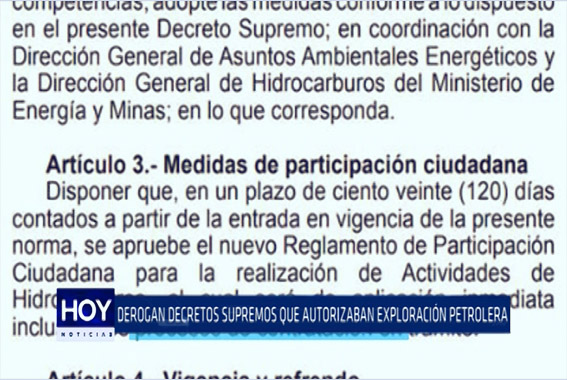 El Ministerio de energía derogo los cinco decretos supremos que autorizaban los contratos de licencia para exploración y explotación en las costas entre los Departamentos de Tumbes y Áncash. Autoridades y representantes de la sociedad civil saludaron la decisión.