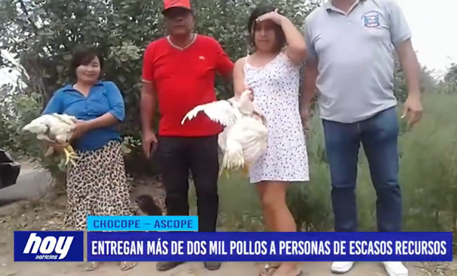Más de dos mil pollos vivos entregó por segunda vez el alcalde del distrito de Chocope, Carlos Alza, a los pobladores de los anexos de esta jurisdicción de bajos recursos económicos.