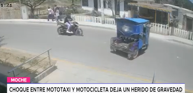 Un fuerte accidente de tránsito ocurrió en la campiña de Moche, donde un mototaxi y una motocicleta colisionaron violentamente, dejando como saldo a una persona gravemente herida. El hecho quedó registrado por una de las cámaras de seguridad de la zona, lo que permitió evidenciar la magnitud del impacto.