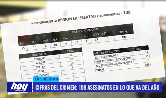 A la fecha se han registrado 108 asesinatos en la región La Libertad, de estos crímenes 64 ocurrieron en la provincia de Trujillo.
