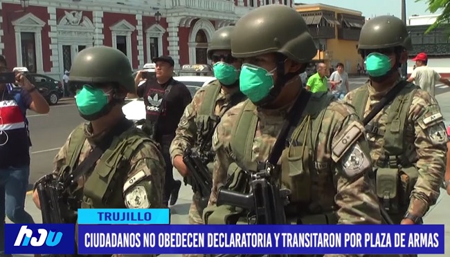 Personas hacen caso omiso a la declaratoria de estado de emergencia. transitan y descansan en la Plaza de Armas de Trujillo, soldados del ejército llegaron al lugar para pedir retornen a sus viviendas.