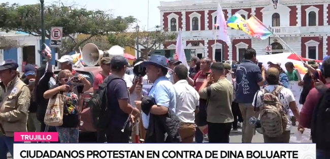 Este grupo reducido de ciudadanos, con banderolas en mano realizaron una protesta en la plaza mayor de Trujillo, ellos exigen derogatoria de leyes que según señalan favorecen a los delincuentes, asimismo pidieron la salida de Dina Boluarte.