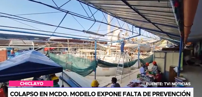 La tarde del último viernes colapsó parte del techo de la sección carnes del Mercado Modelo de Chiclayo. El hecho ocurrió mientras se desmontaban aleros, dejando a seis obreros heridos. Bomberos y personal del SAMU acudieron rápidamente al rescate.
