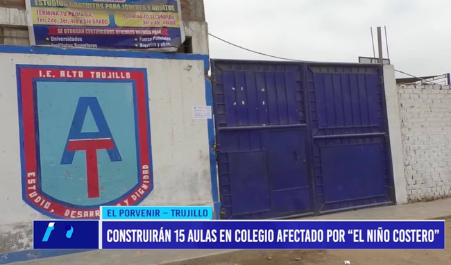 El alcalde distrital de El Porvenir anunció la construcción de 15 aulas en el colegio “Alto Trujillo”, luego de que padres de familia y la directora exigieran a la autoridad para la reconstrucción con cambios reconstruir la infraestructura que fue afectada por el Niño Costero.